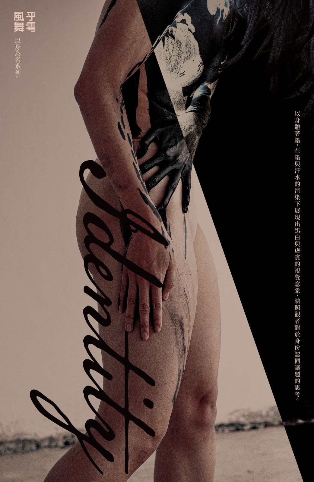 「 Identity」是對自己的身份定位,並按照自己的方式定義自己。透視「我」與「Identity」的關係, 促使觀眾思考形塑我是誰的內在和外在因素,並意識到身份總是遠不止於肉眼所見。身體是文化的載體,墨為文化的象徵,而文化是身份的符號。重新看待其邊界範圍,如同水墨與舞蹈凝結而成的意象,在實存的墨暈與身體線條間探看身份樣貌,映照出觀者對於身份(Identity)的思考。